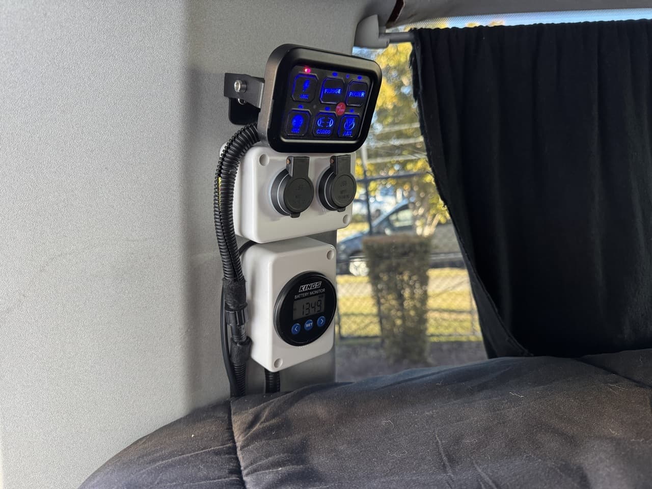 A lithium battery system with inverter, and a Kings battery monitor with control panel, and with 12V outlets, plus solar panel for off-grid capability. Dual awnings, roof racks, mag wheels and tow bar complete the ultimate camper package.